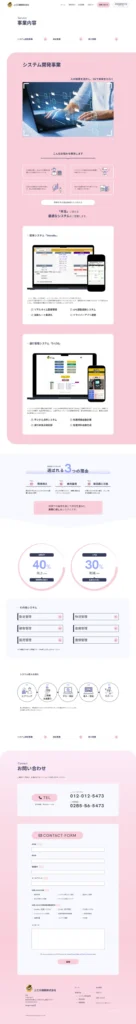 ご要望としていただいたパステルピンク(#F9CED9)を全体のトーンとして採用しながら、過度に可愛らしくならないよう、ホワイトやグレー、ブルー系の写真を組み合わせることで業務の誠実さと専門性を両立させた。事業の幅広さがひと目で伝わるよう、メインビジュアルには運送・鉄工・システム開発 の3つの軸を象徴的に配置し、企業の特徴を視覚的に表現している。また、余白感をたっぷりと確保したレイアウトにより可読性を高め、業務の誠実さと温かみを両立。システム領域では図解やアイコンを用いて複雑な情報を整理し、誰にとっても理解しやすい“開かれた企業姿勢”をデザインとして体現した。